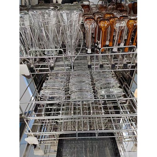 Load the laboratory utensils onto the container loading basket, load them into the inner cavity of the cleaning machine through the slide rail, remove the pollutants (including organic matter, inorganic compound, protein, etc.) on the containers through the cleaning steps, and clean the residues on the containers; Remove pollutants and cleaning agent residues on the utensils through rinsing steps, so that the ion residue on the utensils is lower than the detection limit. Remove cells, viruses, and bacterial residues on the utensils through disinfection steps, reducing the number of live microorganisms to the specified level; Remove residual water on the surface of the vessel through a drying step, allowing the residual water to vaporize and evaporate.